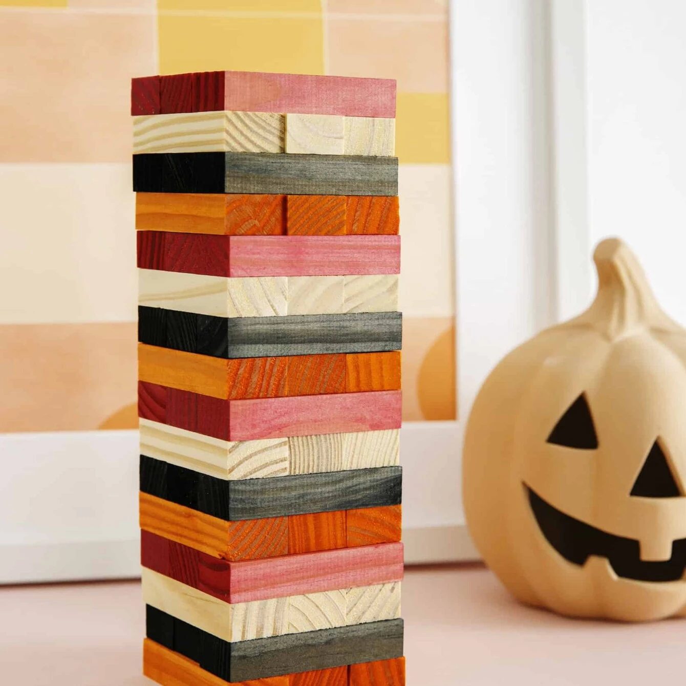 Jenga na Halloween w kolorach Tangerine, Fuchsia i Black przyciąga uwagę od pierwszego spojrzenia. Tworzy klimat napięcia i rywalizacji w mrocznej odsłonie. Idealna gra, która wyróżni każdą imprezę tematyczną.