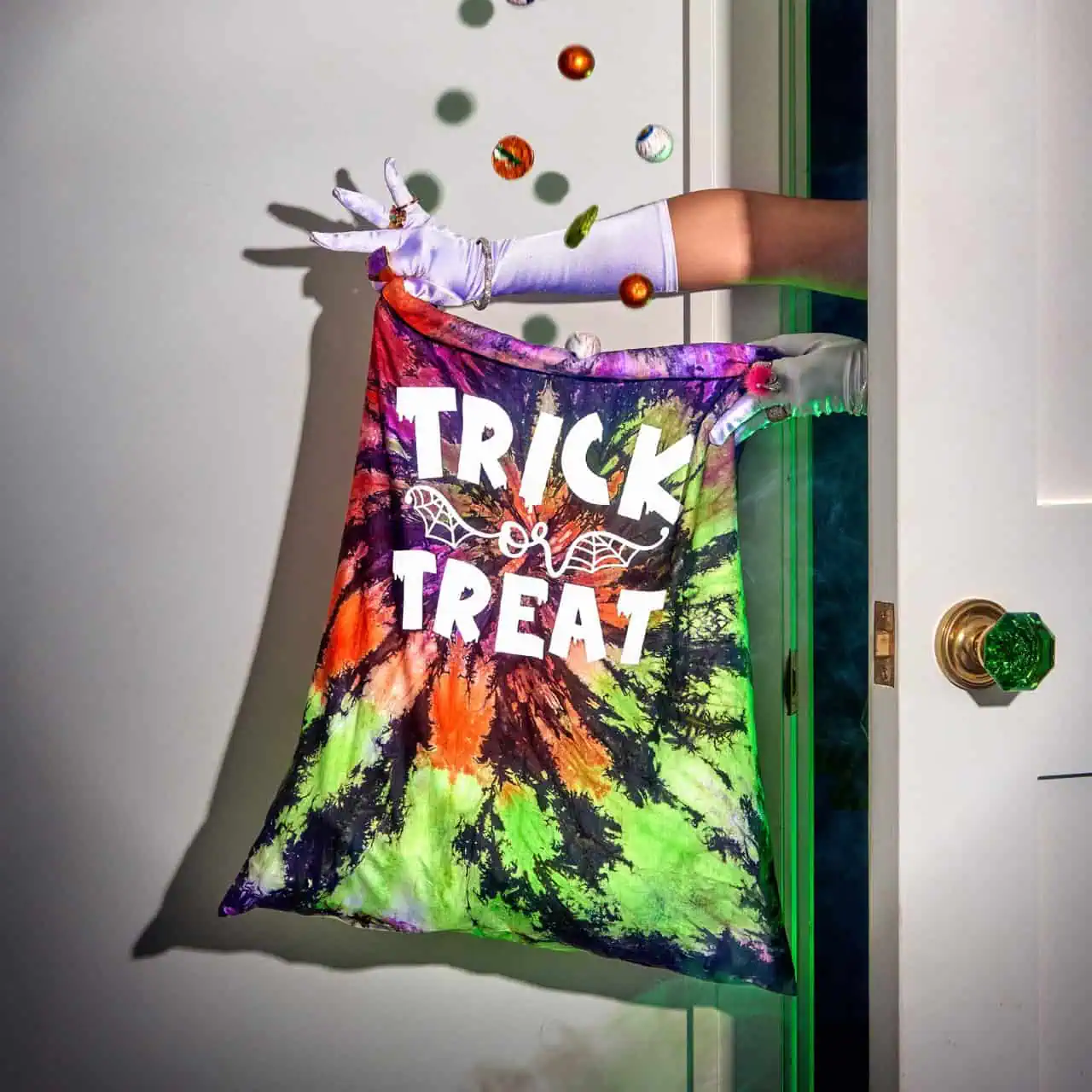 Worek na cukierki tie-dye przyciąga wzrok kolorami. Jest lekki i praktyczny. Idealny na Halloween w luźnym stylu.