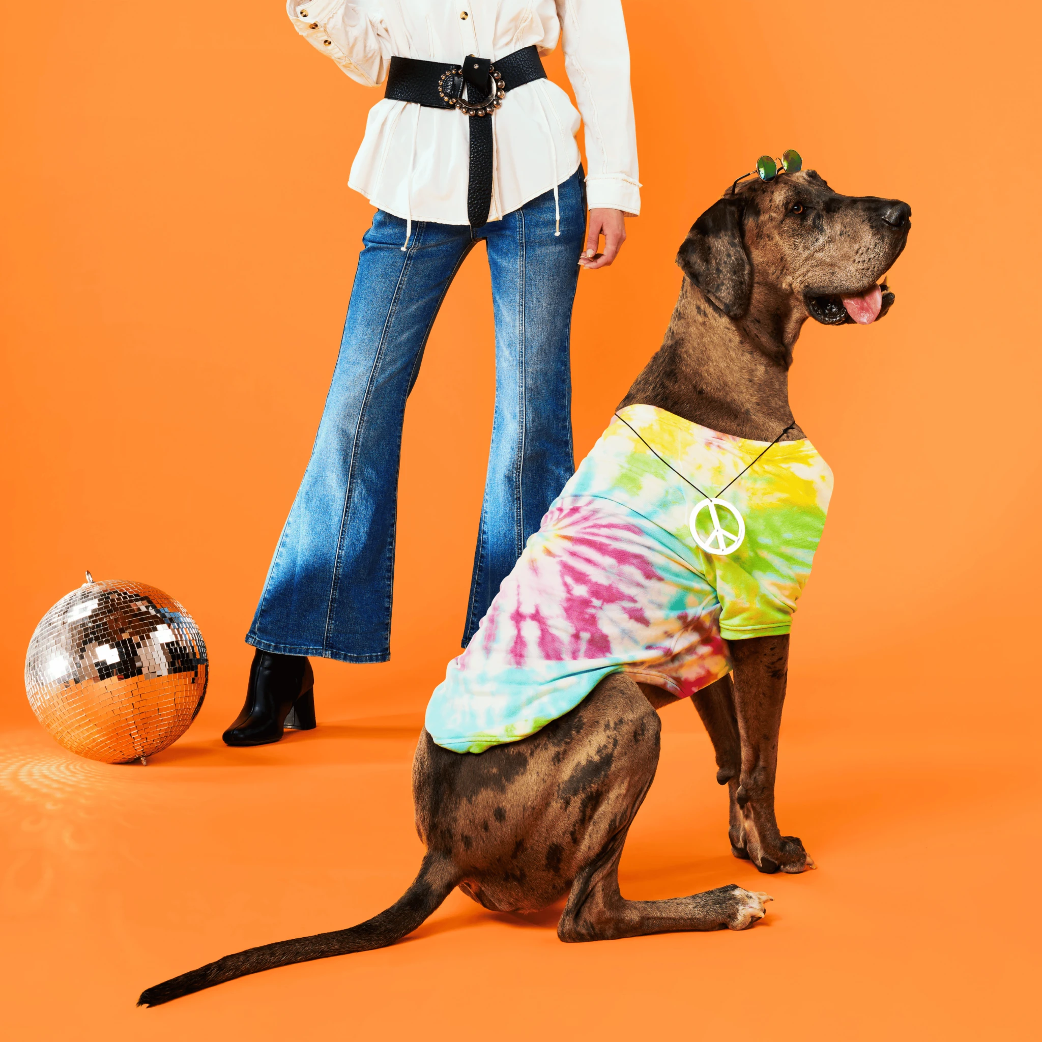 Kostium Groovy Dog to czysty klimat retro lat 70. Kolorowy tie-dye i pełen luzu styl wyróżniają się na każdym Halloween. To wybór dla tych, którzy stawiają na zabawę zamiast strachu.