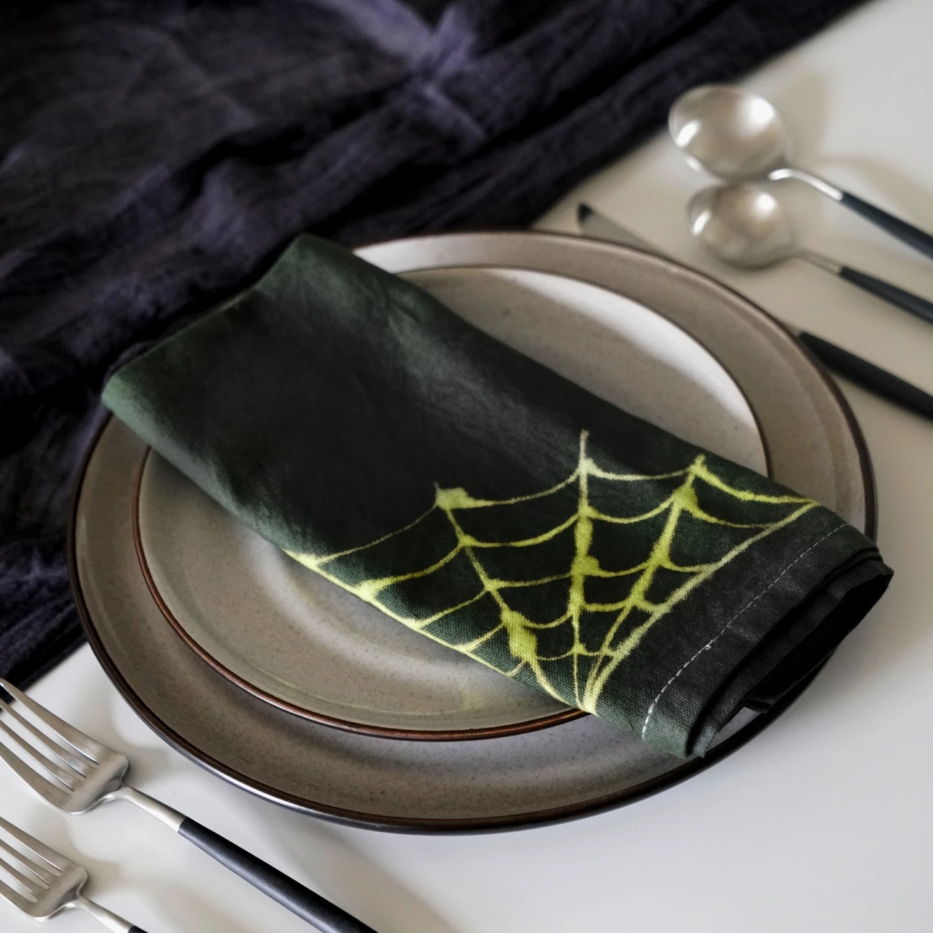 Serwetki z odwróconym wzorem tie-dye w pajęczynę przyciągają uwagę hipnotyczną grą linii i kontrastu. Technika barwienia tworzy nieoczywisty rysunek, w którym środek i tło zamieniają się rolami. To dekoracja stołu, która balansuje między kontrolą a przypadkiem i zostaje w pamięci.