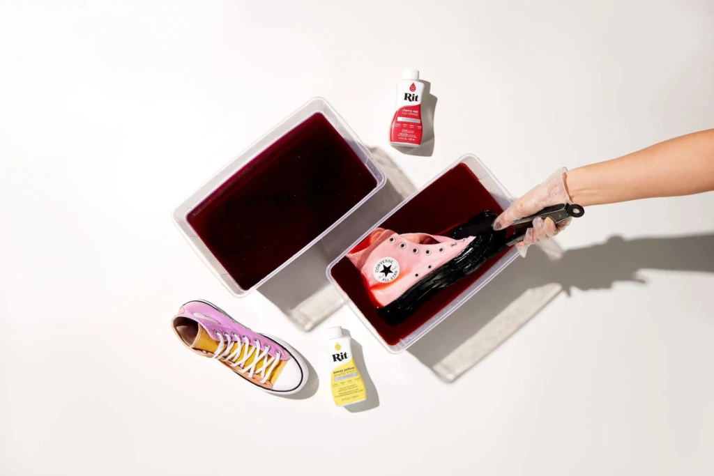 - Wyjmij buty Chucks z kąpieli barwiącej i szybko opłucz w zimnej wodzie.